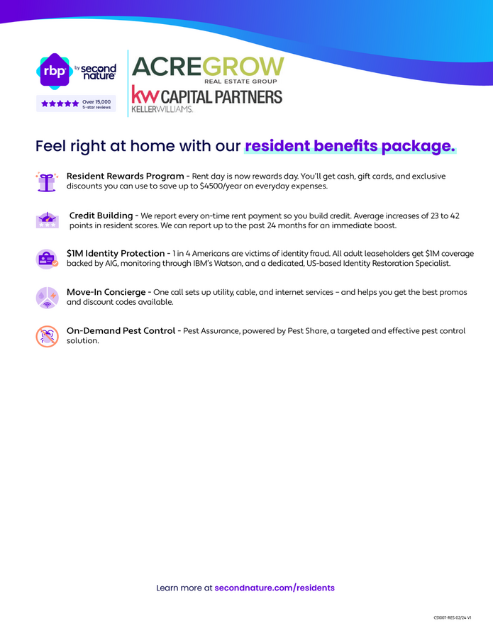 At Acregrow, we strive to provide an experience that is cost-effective and convenient. That’s why we offer a Resident Benefits Package (RBP) to address common headaches for our residents. The program handles identity protection, pest control, utility set up, credit building, rent rewards, and more. More details upon application.