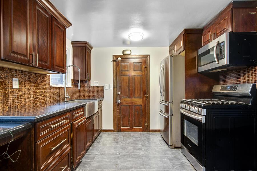 The kitchen showcases deep brown cabinetry paired with a stylish mosaic backsplash and comes equipped with a refrigerator, stove, and microwave. You’ll also enjoy plenty of cabinet and counter space, along with a convenient built-in pantry unit for additional storage.