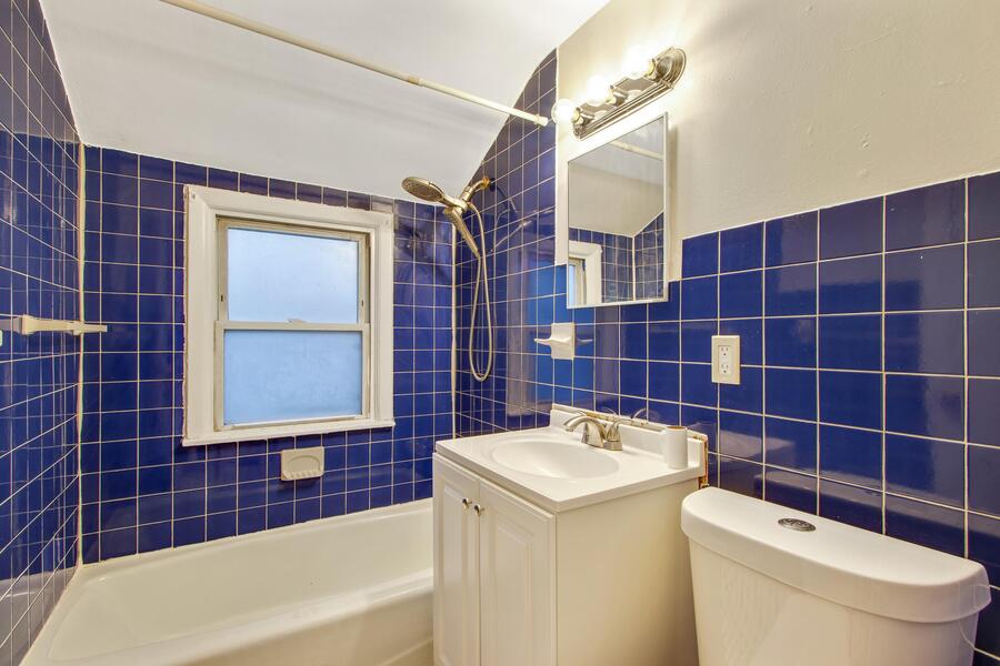 Upstairs, you’ll find the bathroom highlighted by a pop of color that adds character to the space. It includes a shower/tub combo and a vanity for everyday convenience.