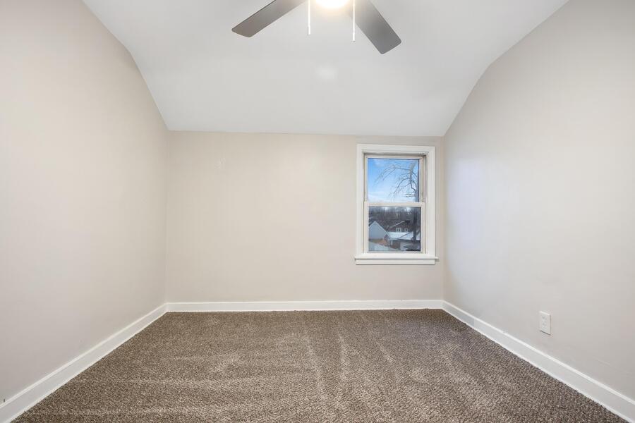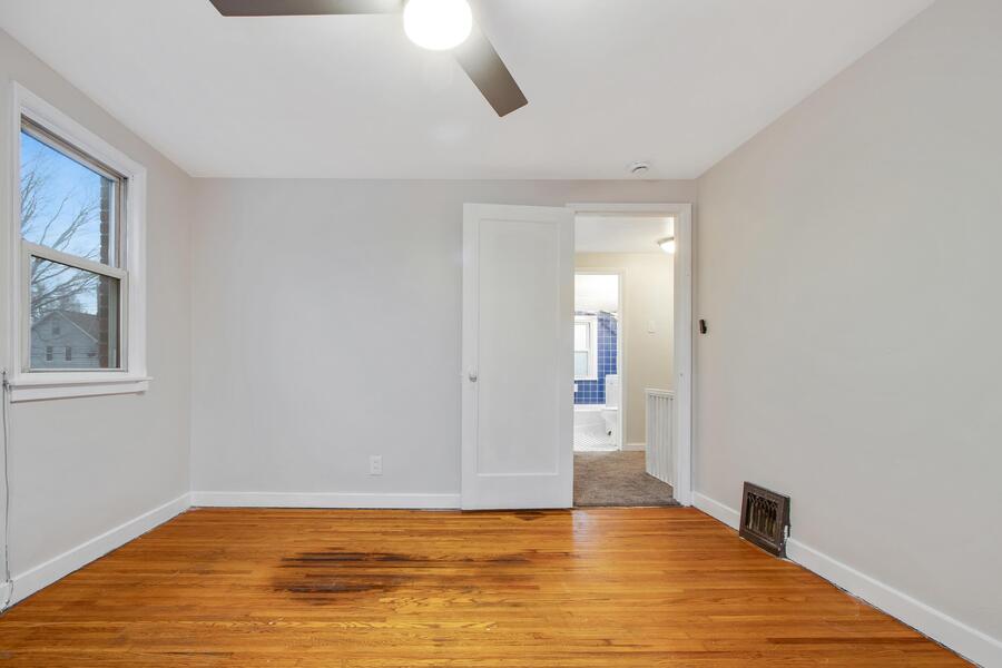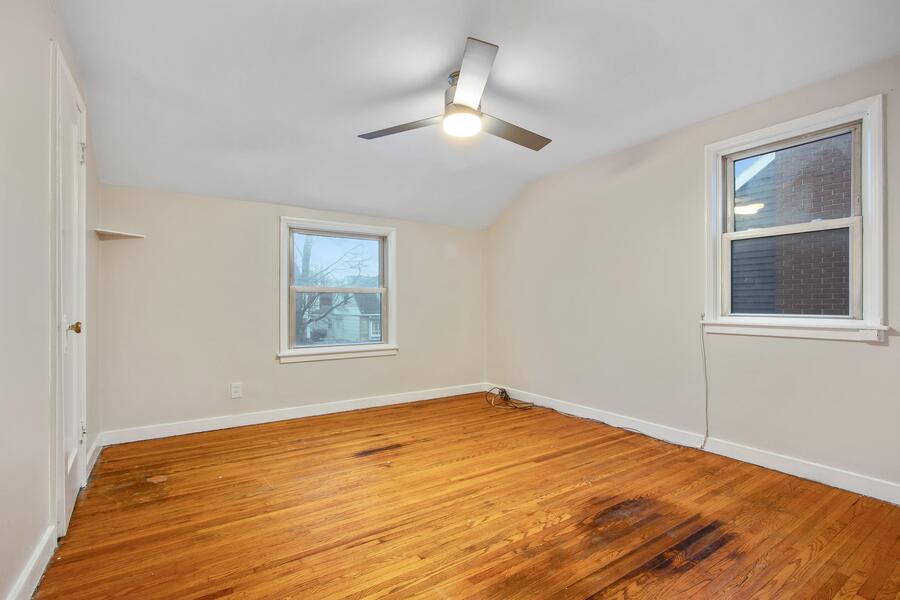 Both bedrooms are located upstairs. The smaller bedroom is fully carpeted and features a ceiling fan and its own closet, creating a cozy retreat. The larger bedroom offers beautiful hardwood flooring, a ceiling fan, and its own closet, providing a spacious and comfortable setting.