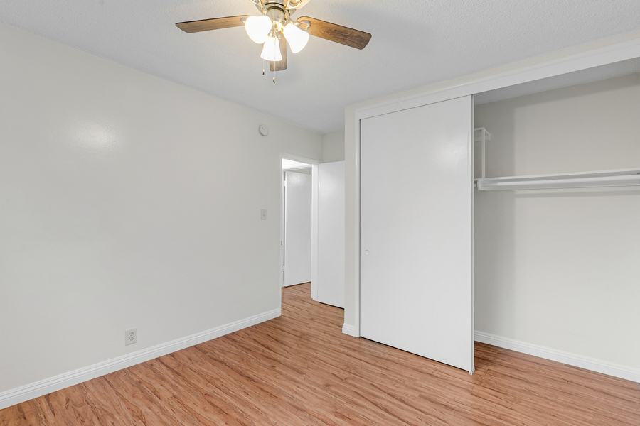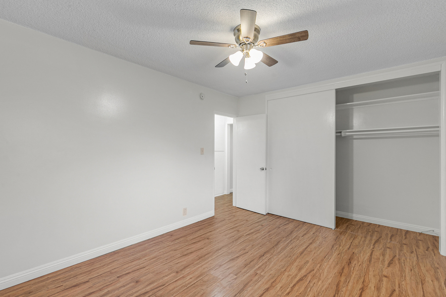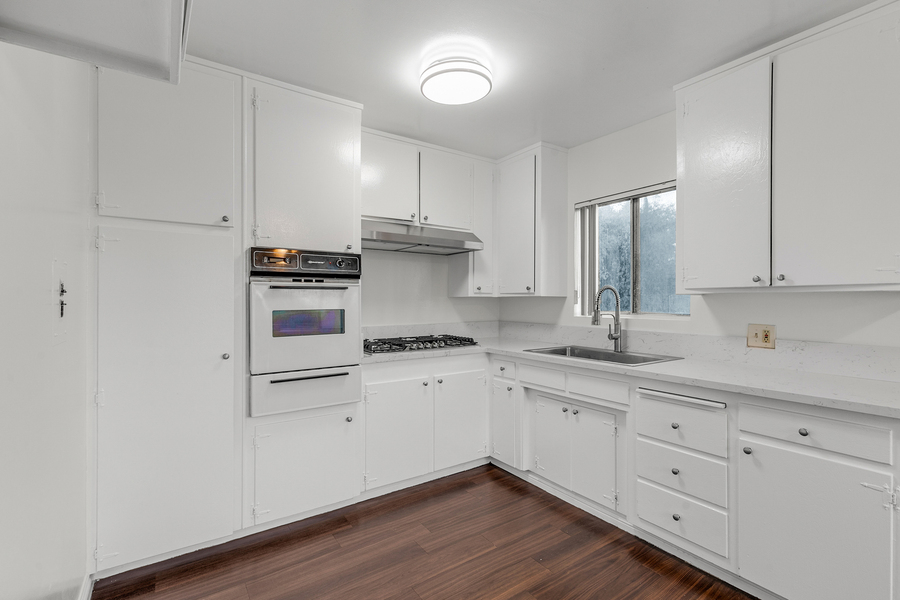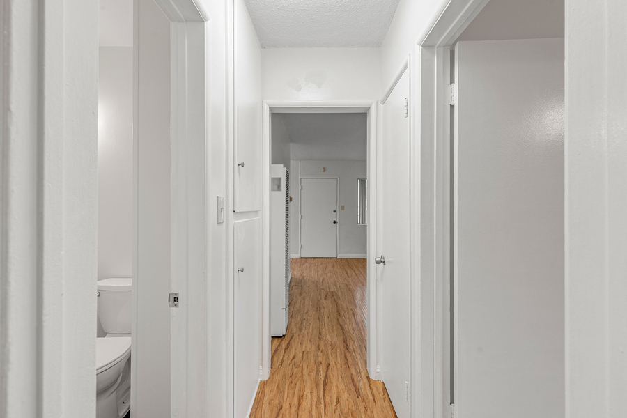 The kitchen has been thoughtfully updated with quartz countertops, a stove, new range hood, and refrigerator, making it both stylish and functional. The bathroom keeps its original tile and has that cute mid-century charm that feels perfectly at home by the coast. Wood-look flooring runs throughout the unit, giving it a clean, airy vibe, and ceiling fans in every room help keep things cool and comfortable.