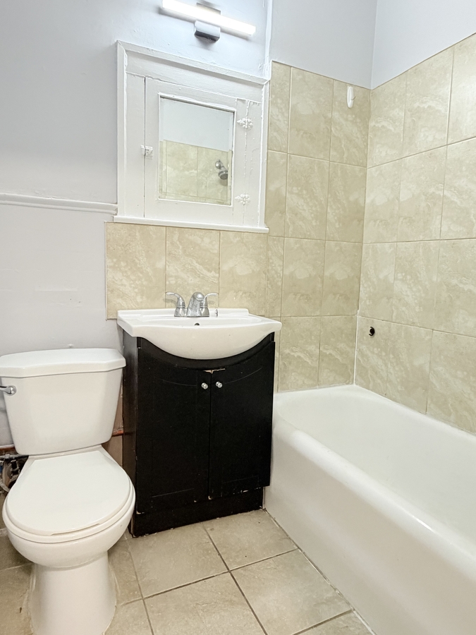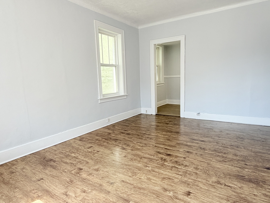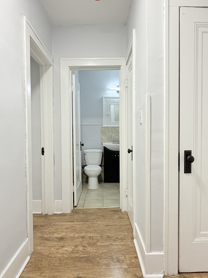 The apartment features a bright and spacious living room with fresh paint, luxury vinyl plank flooring, and modern black fixtures throughout. The bathroom includes a new tub, vanity, and toilet, creating a warm and modern feel. The bedroom is comfortably sized and filled with natural light.