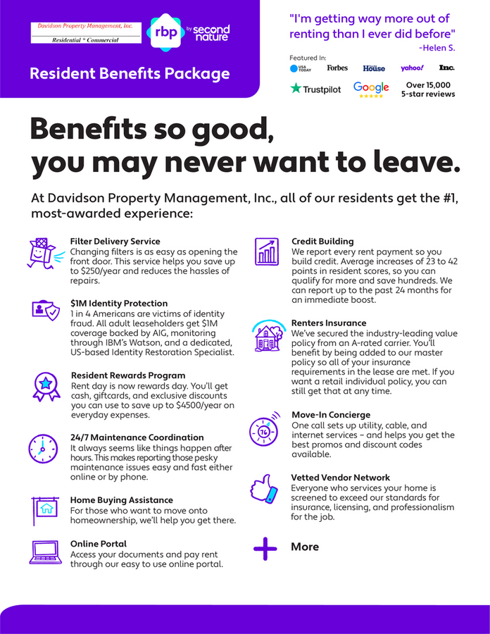All Davidson Property Management, Inc. residents are enrolled in the Resident Benefits Package (RBP) for $45.95/month which includes liability insurance, credit building to help boost the resident's credit score with timely rent payments, up to $1M Identity Theft Protection, HVAC air filter delivery (for applicable properties), move-in concierge service making utility connection and home service setup a breeze during your move-in, our best in-class resident rewards program, and much more! More details upon application.