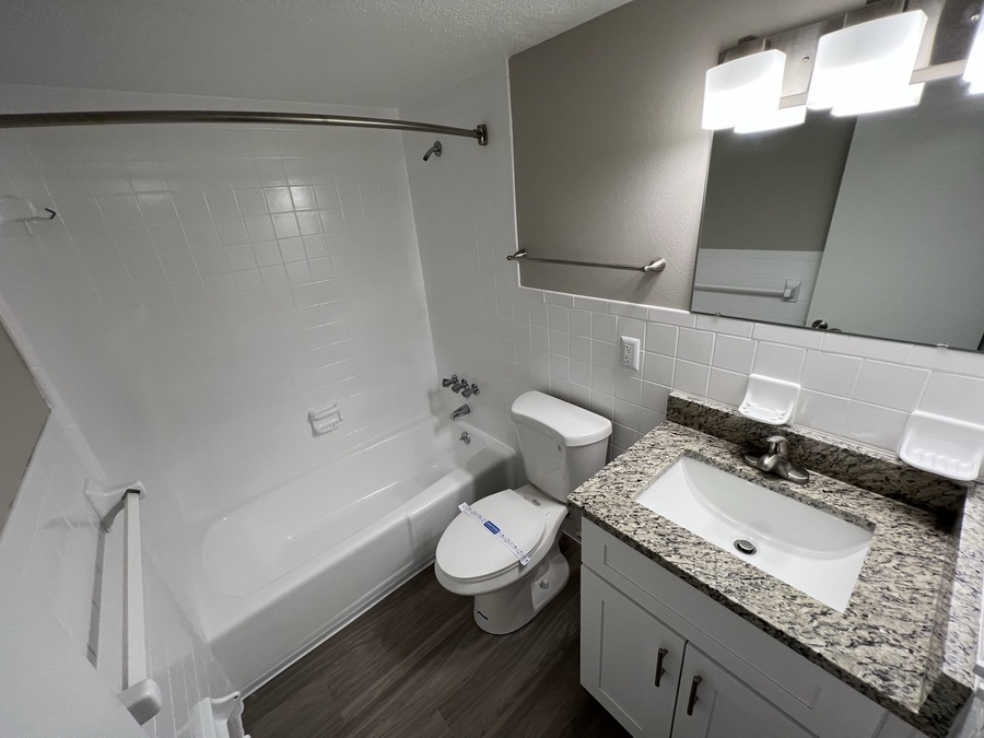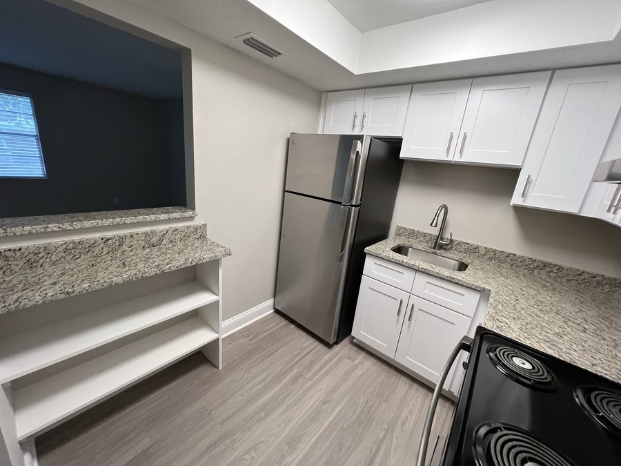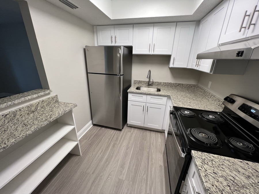 Fully renovated kitchen with granite countertops and stainless steel appliances