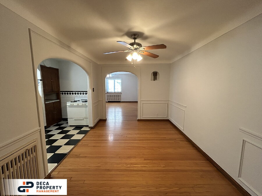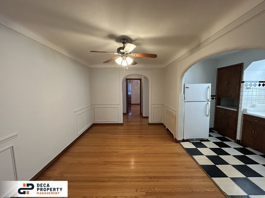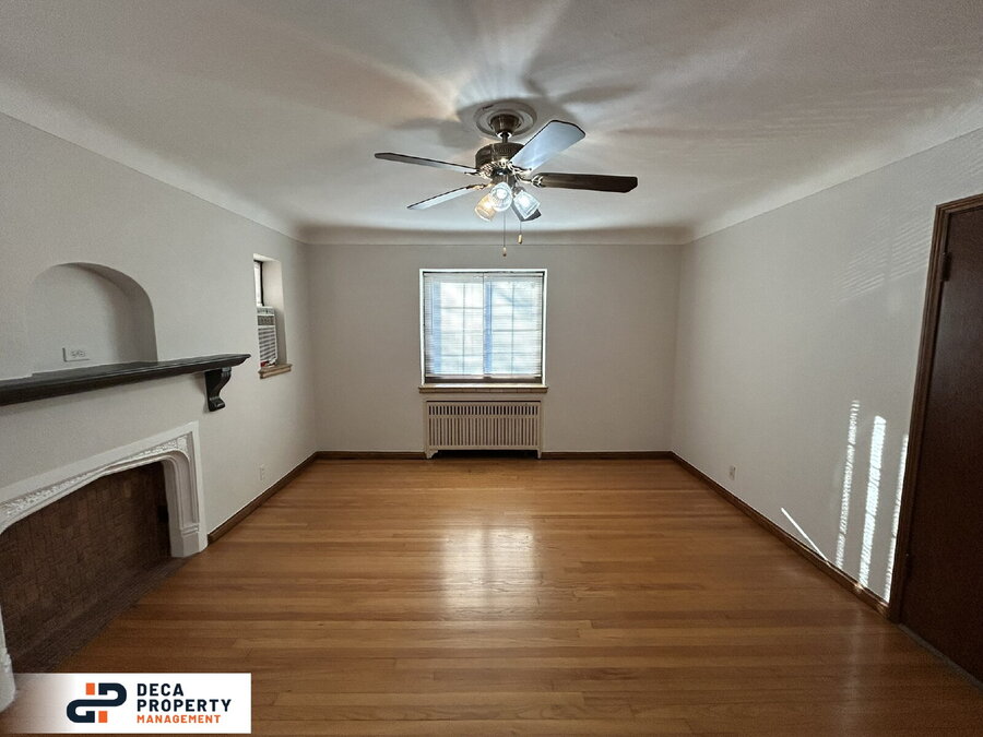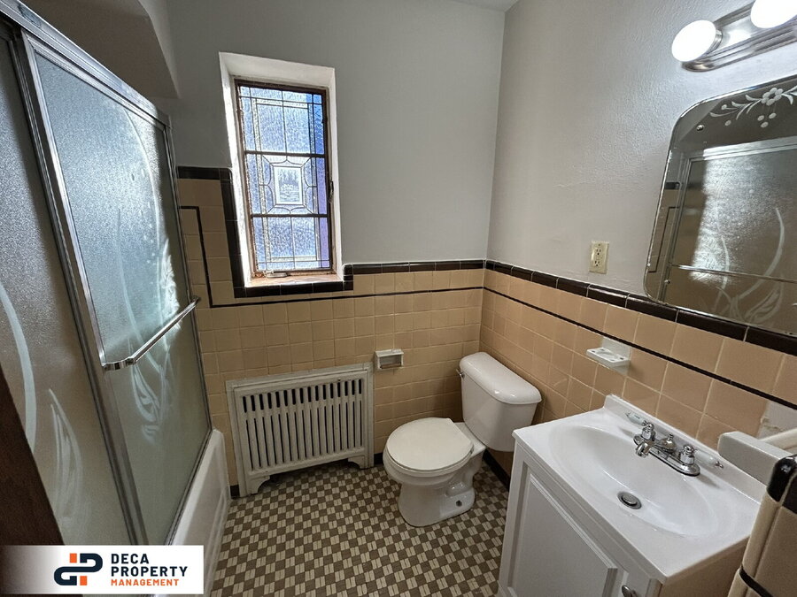 Beautiful and charming 1-bedroom, 1-bathroom second-floor apartment for rent! Enjoy the curb appeal of a classic brick building highlighted by detailed stonework and an eye-catching peaked roofline. Step inside to a bright living room featuring gleaming hardwood floors, stunning stained-glass windows, and abundant natural light.