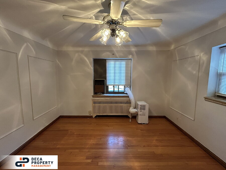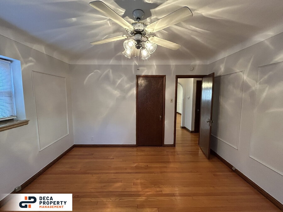 The bedroom is cozy yet spacious, complete with hardwood flooring, a ceiling fan, and plenty of room to relax and unwind.