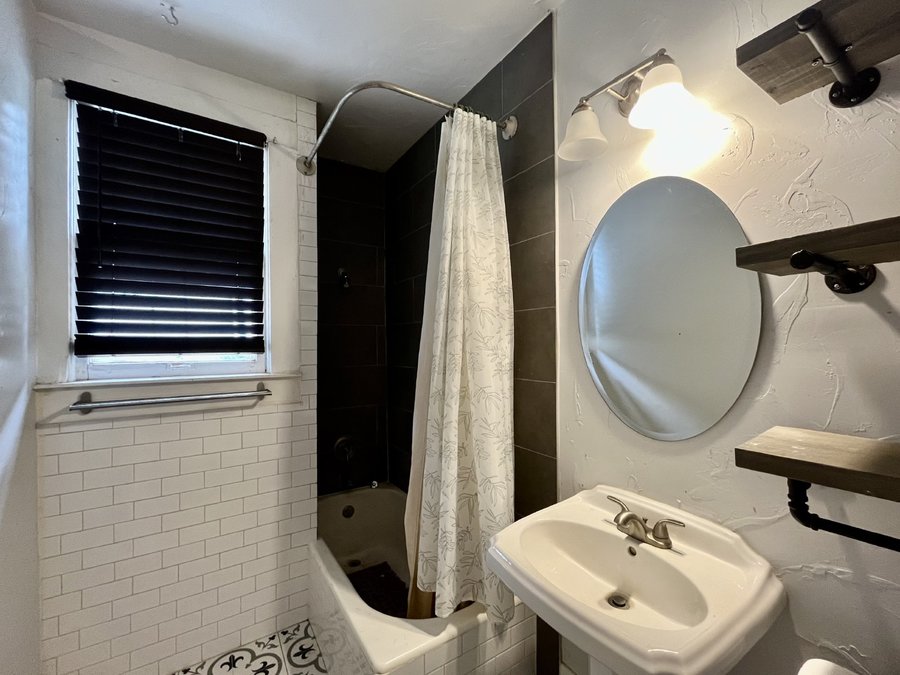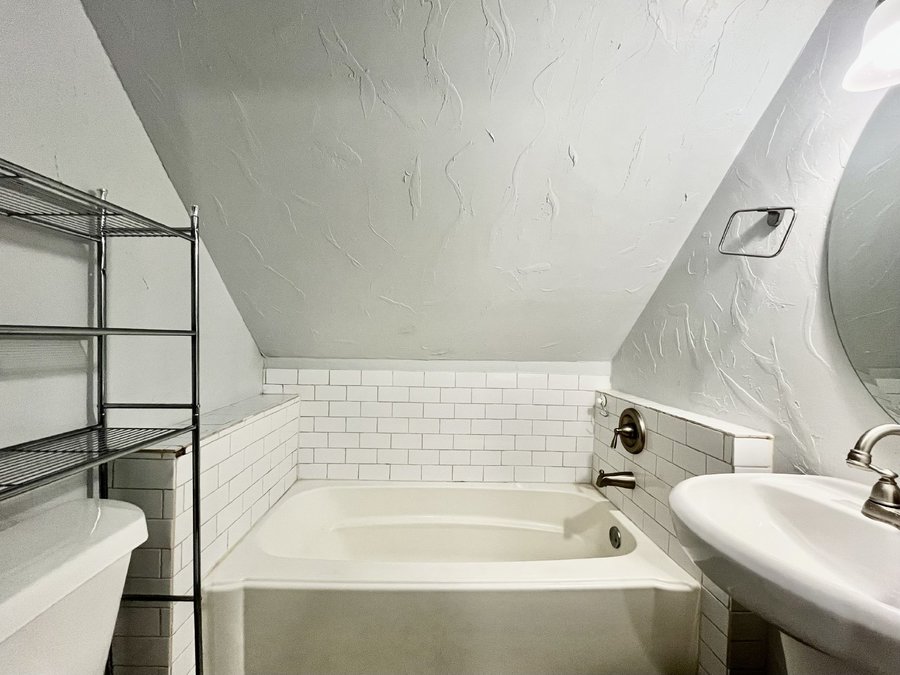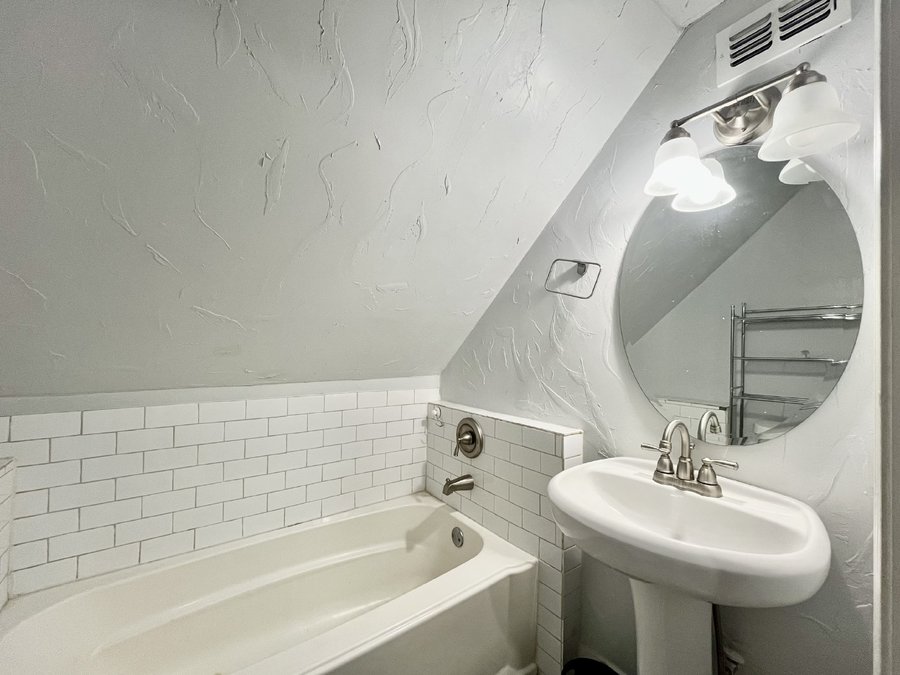This home features one full bathroom downstairs and one upstairs, each with a shower/tub combo and a pedestal sink, providing comfort and style.