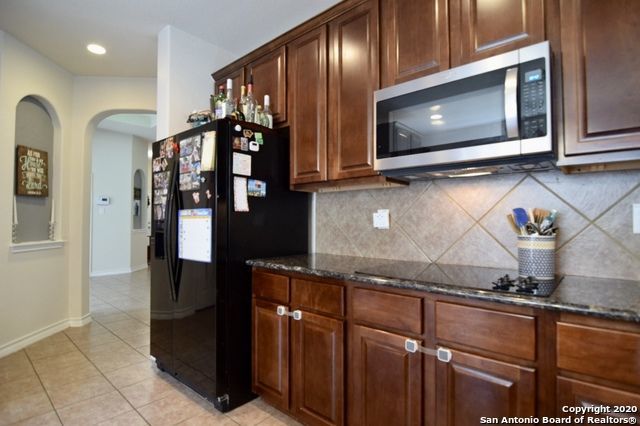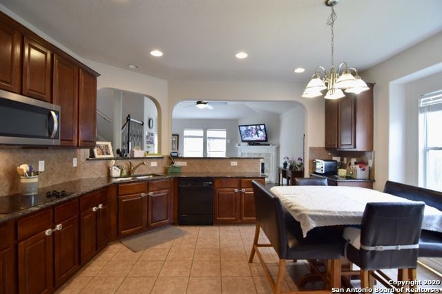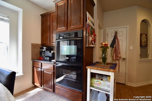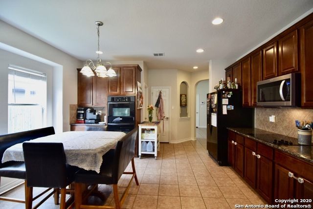 The well-equipped kitchen is a standout, complete with a double built-in wall oven, electric cooktop, dishwasher, microwave, refrigerator, and a cozy eat-in area, perfect for casual meals or morning coffee.