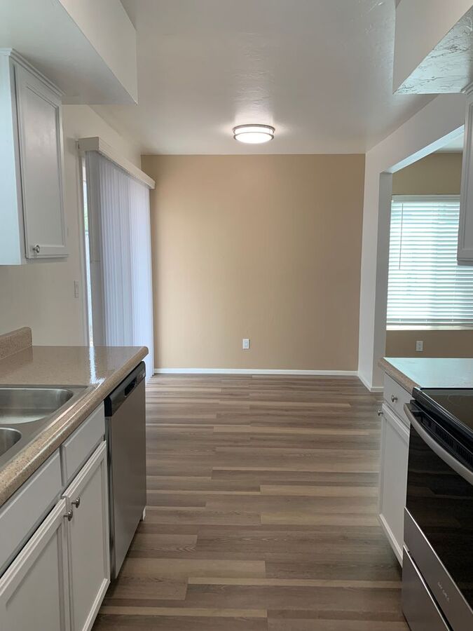 This spacious 2 story townhome has a family friendly back yard! Right across from Limberlost Family Park. Not your typical townhome. The unit is 1150 sq. ft. 2 bedroom 1 1/2 bath unit with a 1/2 bathroom downstairs and full bathroom upstairs with LVP flooring. This unit includes a FULL SIZE washer and dryer in unit, Stainless steel kitchen appliances to include dishwasher, built in microwave, electric glass top stove and refrigerator plus a gas fireplace and remote controlled ceiling fans in the bedrooms and living room. It comes with two assigned FREE covered parking spots and an incredibly spacious backyard!
