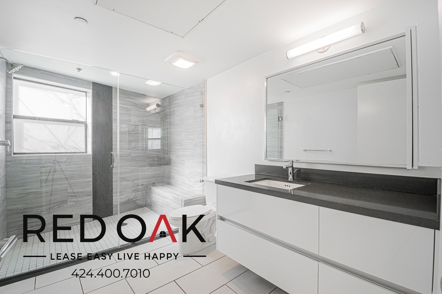 ~ Spa-like Bathroom: Walk-in glass shower, vanity storage, and bright mirror.
