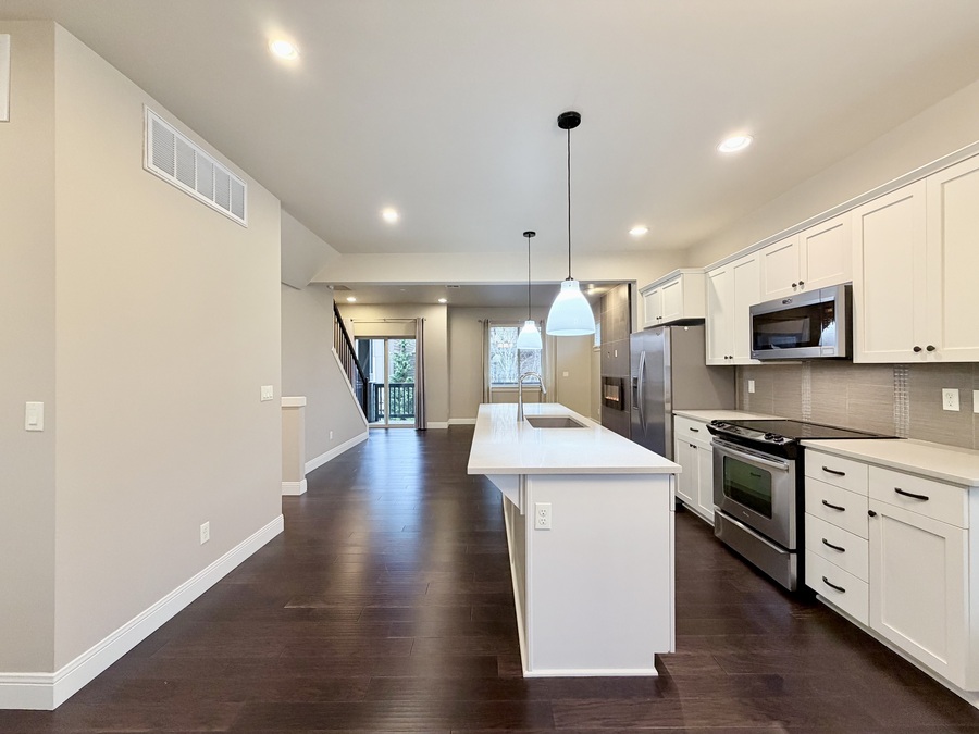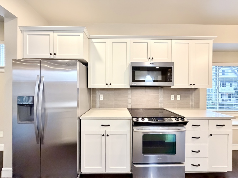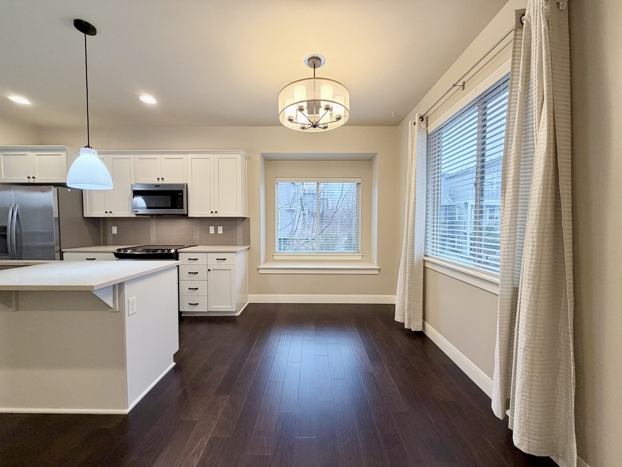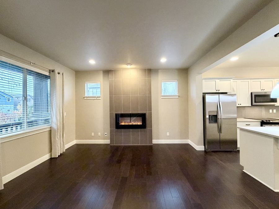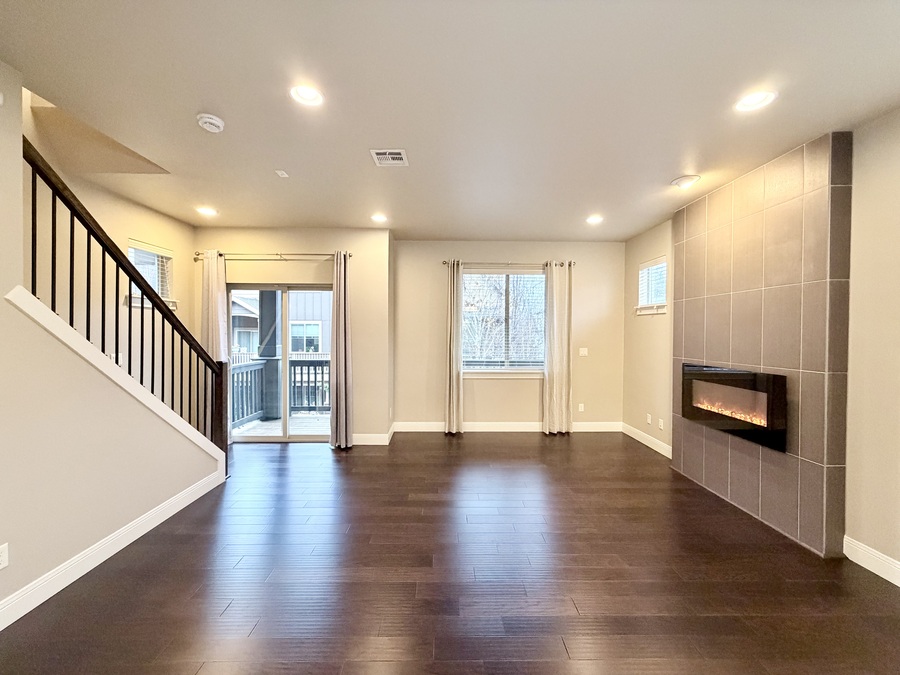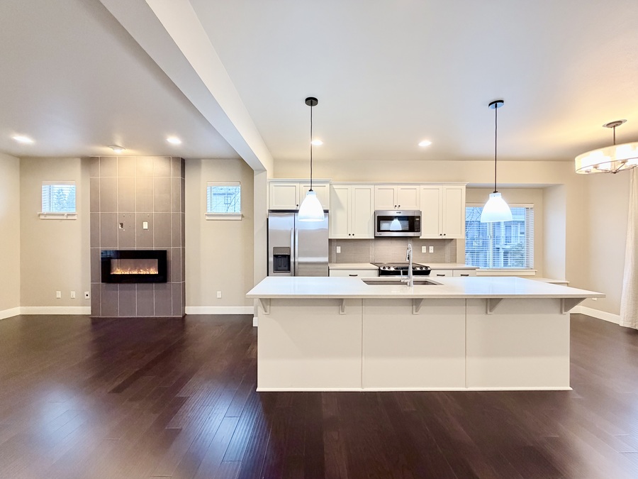 The kitchen shines with stainless-steel appliances, real hardwood floors, a slab-quartz island, and stylish built-ins. 🍳✨ A sliding door off the dining area leads to a cozy patio, while the living room offers an electric fireplace for warm ambiance plus access to a deck for fresh air and relaxation. 🔥🌤️