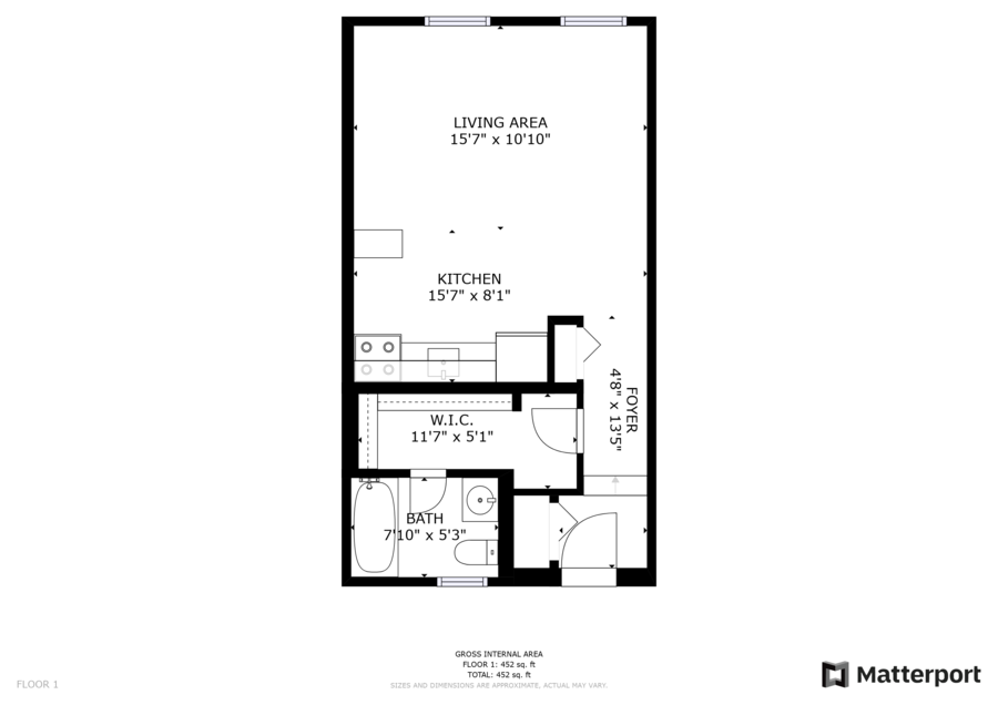Bright open studio space and terrific design options for your bed and additional furniture. Kitchen has stainless steel appliances, gorgeous cabinets and ample countertop space. Large walk-in closet with built in shelf allows for great storage space and is attached to bathroom. Bathroom has modern fixtures and finishes.