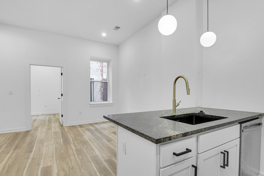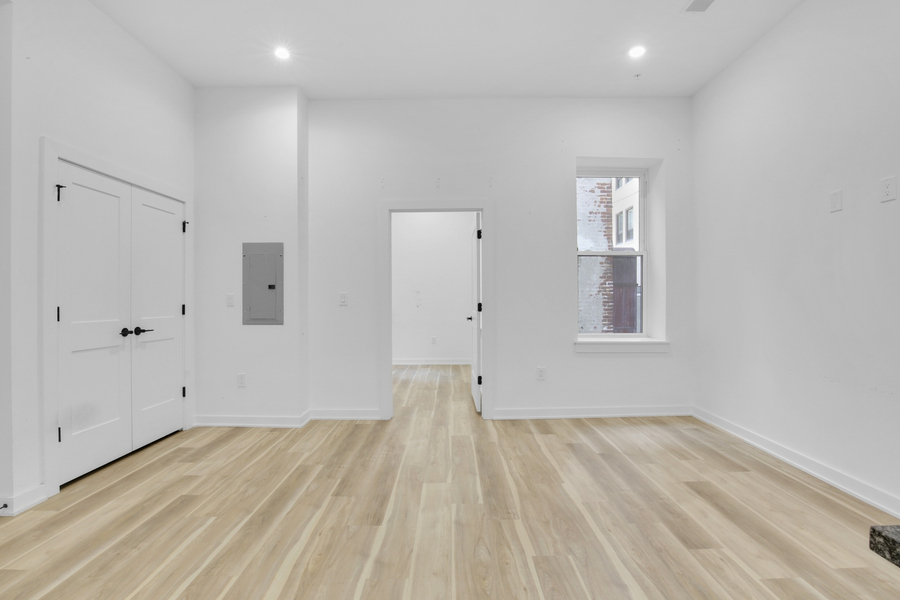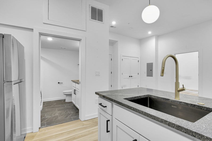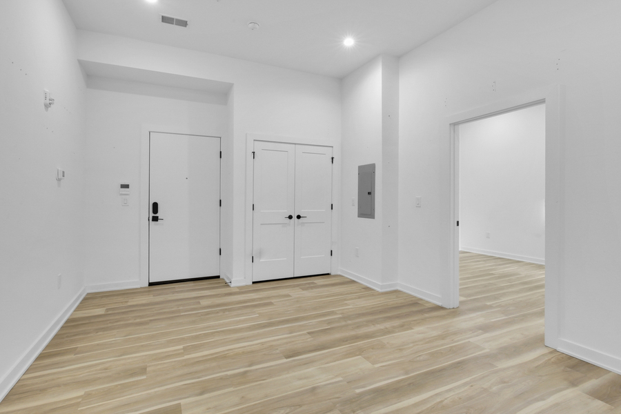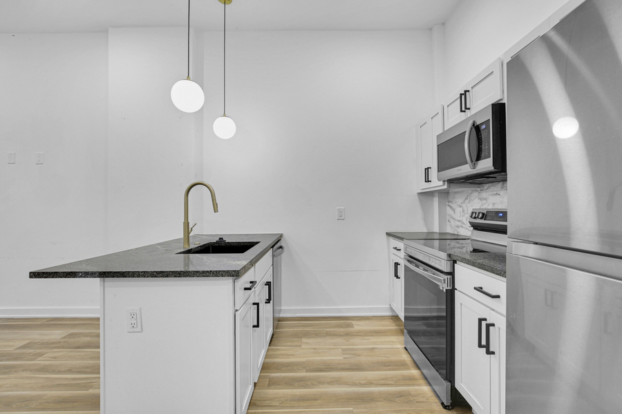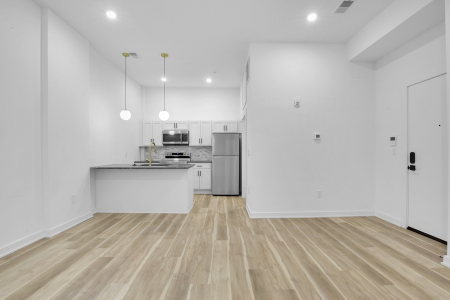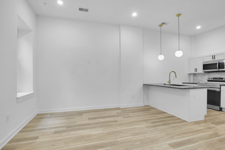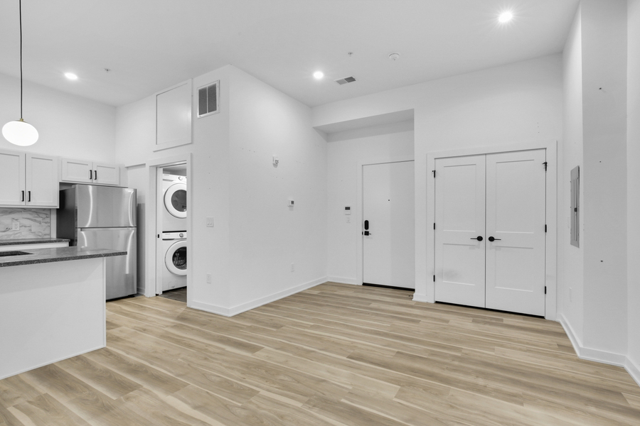 Experience modern city living in Unit #503, a gorgeous 1 bedroom, 1 bathroom rental apartment. The spacious living room features beautiful wood floors and recessed lighting, while the contemporary kitchen boasts white shaker cabinets, stainless steel appliances, and tile backsplash.