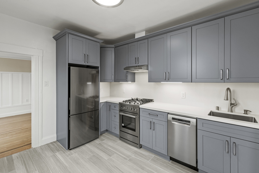 Step inside to find a brand-new kitchen and bathroom, gleaming hardwood floors, and abundant natural light throughout. The open layout includes a bonus nook next to the in-unit laundry—ideal for a home office or study space.