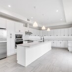 Through the dining room, we enter into the recently updated kitchen. It features stainless steel appliances, sleek new countertops and cabinetry, updated flooring, and your very own stacked washer and dryer tucked into the space. With all of those upgrades, there's still room to spare. Just add a bistro table or kitchen island to finish it off.